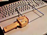 | スチロールカッター | 糸ノコと同じ形をしていますが、ノコの部分が電熱線になっていて、熱でスチロールを溶かします。静電気で削りカスがまとわりついたりしないし、大きなものもスパッと切れる。これは、ハッコーというメーカーの「スチロールカッター」。上にボタンがあって、これを押しているときだけ電気が通るのがうれしい。あと、250度のターボモードと170度のノーマルモードがある。 |