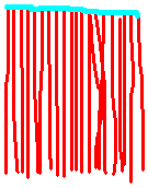 - まず、髪を一定の長さに切り揃え、横に並べます。次に、右図のように、一方の端を接着剤でくっつけます。こうして、横幅5cmほどの束をいくつも作ります。